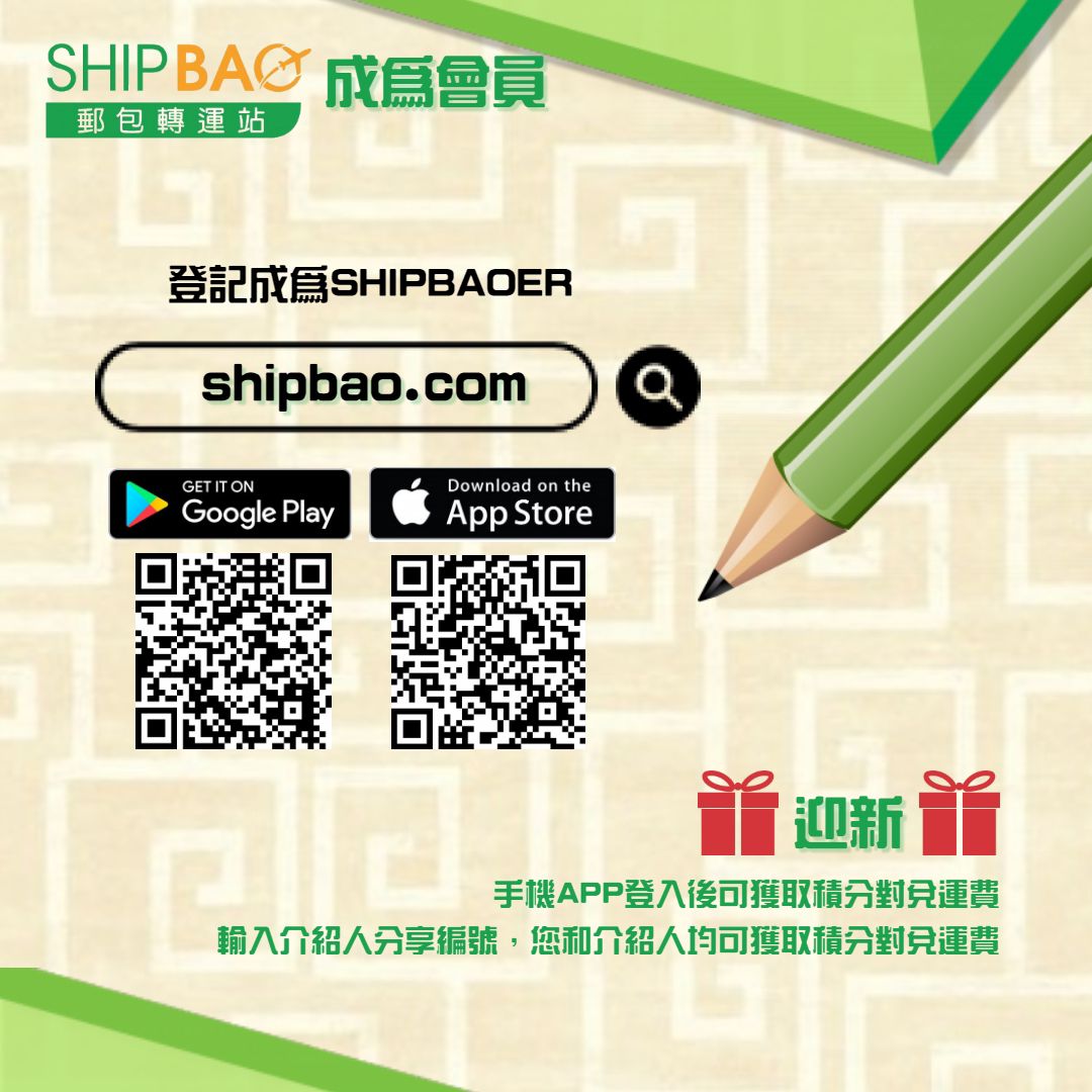 下載Shipbao郵包轉運站手機App,成功登入後可獲取200積分,兌換作$20運費之用。
